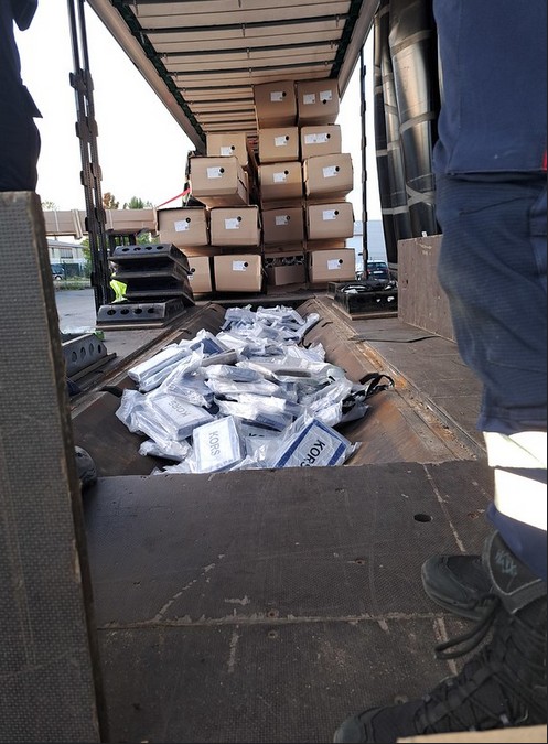 Le déchargement complet de la marchandise a permis la découverte de nombreux pains rectangulaires dissimulés dans les travées du chargement, pour un poids total de près de 405 kg de cocaïne.